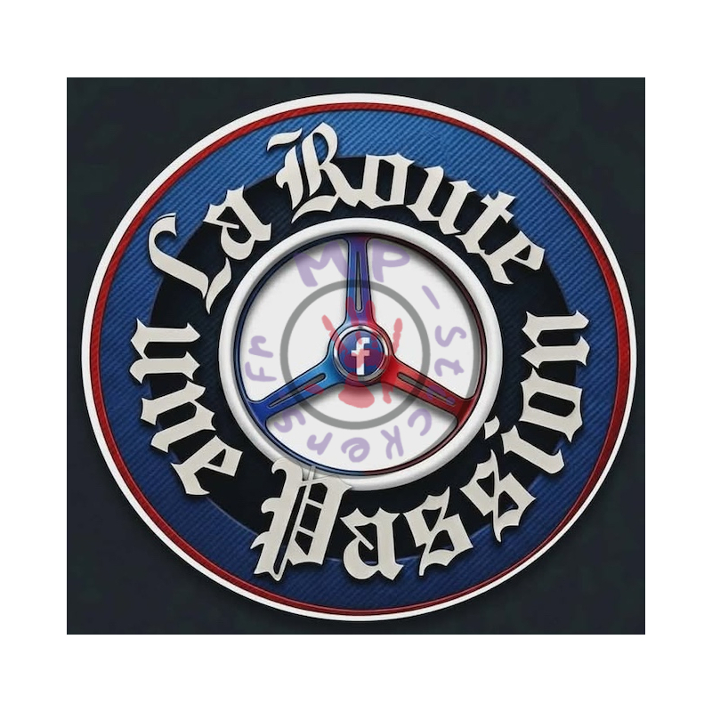 Sticker rond avec inscription la Route une Passion blanche en rond avec volant 3 branches et centre blanc en vinyle de qualité, en impression quadri sur vinyle de qualité puis découpé dans la masse.