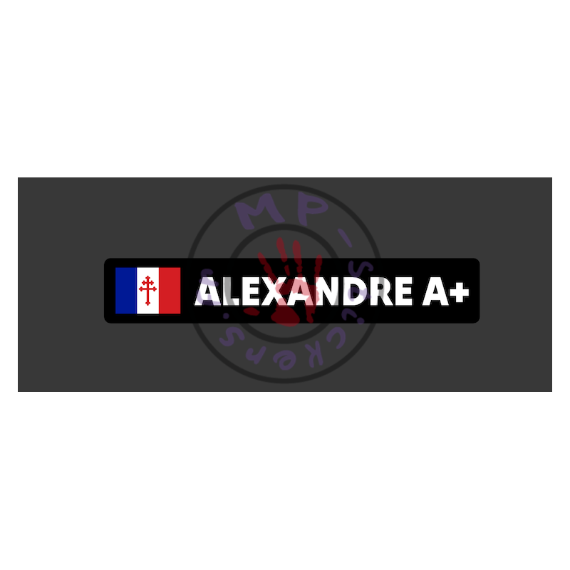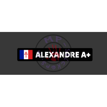 Sticker avec drapeau FRANCE et inscription ALEXANDRE A+ en blanc en vinyle de qualité, imprimé puis découpé dans la masse, avec fond noir.
