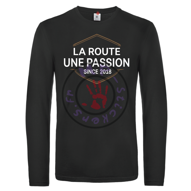 Flocage au nouveau logo 2026 la Route une Passion sur un t-shirt manches longues semi peigné 100% coton en 185g/m², donc un t-shirt de qualité qui ne bougera pas au lavage et tiendra dans le temps.